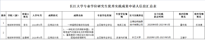 根据《关于开展“2021年长江大学专业学位研究生优秀实践成果”评选工作的通知》要求,乐竞体育在线积极组织学生开展了成果申报动员工作,经学生申请,乐竞体育在线审核,拟推荐成果2项,现对此予以公示。最终获奖情况以研究生院审定结果为准。公示时间为2021年5月28日至5月30日。公示期内如有任何异议,请与学科办联系。联系电话:027-69111109。