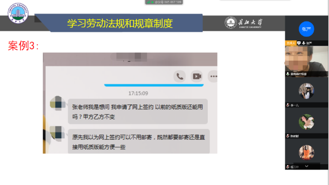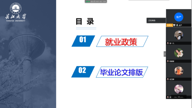 在就业政策讲解部分,张老师就引导学生如何获悉并充分发挥就业政策的作用,学习利用劳动法规保护自己,同时我们自己又应该遵守哪些规章制度来规避风险,以及熟悉学校、学院就业工作基本程序和相关规定等方面进行了介绍。讲解过程中,除了向同学们介绍在疫情环境下国家政府在扶持大学生就业创业方面的鼓励、优待政策以外,还向同学们推广了“长江大学就业信息网”政策法规专栏,引导学生充分挖掘并利用资源了解国家各部委、各省市等制定的吸引人才、促进就业创业的政策。此外,会上还利用前期学生线上咨询的案例对学生在就业过程中遇到的具体问题进行分析和引导,避免学生在后面进入相同的误区。