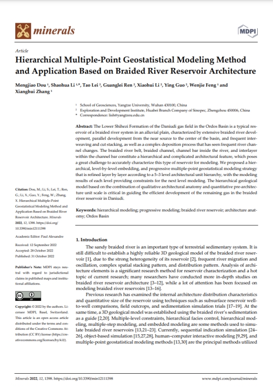 地球科学学院博士生窦梦皎在《Minerals》上发表题为“Hierarchical Multiple-Point Geostatistical Modeling MethodAndApplication BasedOnBraided River ReservoirArchitecture”的研究论文。乐竞体育在线为论文第一署名单位,博士生窦梦皎为论文第一作者,其导师李少华为通讯作者。