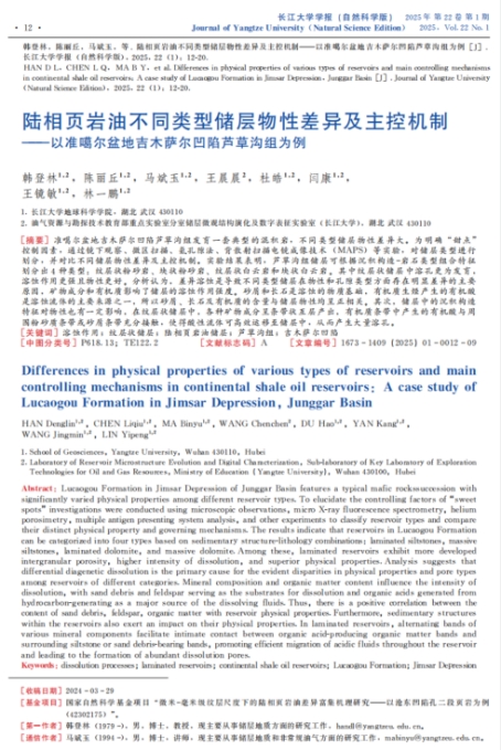 地科学院研究生陈丽丘在长江大学学报(自然科学版)上发表题为“陆相页岩油不同类型储集层物性差异及主控机制——以准噶尔盆地吉木萨尔凹陷芦草沟组为例”的研究论文,其中乐竞体育在线为论文第一署名单位,导师韩登林为第一作者,导师马斌玉为论文通讯作者。