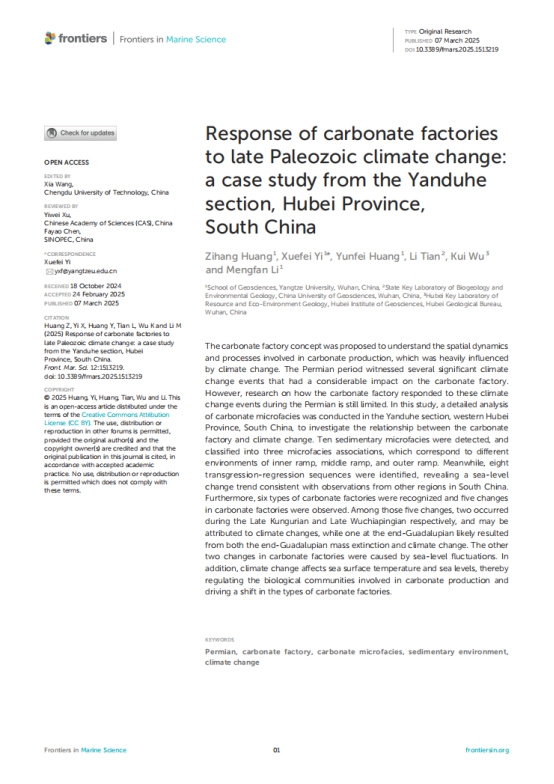地科学院2022级研究生黄子航在海洋与淡水生物学国际2区SCI期刊《Frontiers in Marine Science》上发表题为“Response ofcarbonatefactories tolate Paleozoicclimatechange:acasestudy from the Yanduhe section, HubeiProvince, South China”的研究论文。乐竞体育在线为论文第一署名单位,硕士研究生黄子航为论文第一作者,其导师易雪斐副教授为通讯作者。