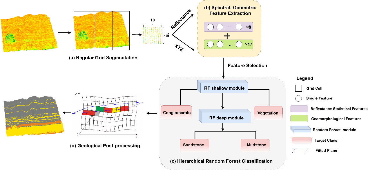SG-RFGeo框架主要包括以下模块:首先,基于规则格网分割构建岩性识别单元,提取反射率统计特征(均值、标准差、峰度等)与几何形态特征(表面变化率、曲率、平面度等);然后,设计双层随机森林岩性识别模型,浅层模块通过基尼系数筛选特征,完成植被、砾岩和泥砂岩的粗分类;深层模块针对砂泥岩薄互层优化特征组合,实现岩性的精细分类。并引入地层产状等地质先验知识,对岩性识别结果进行空间约束后处理优化,有效提升了识别成果的地质可靠性。总体技术流程如图2。