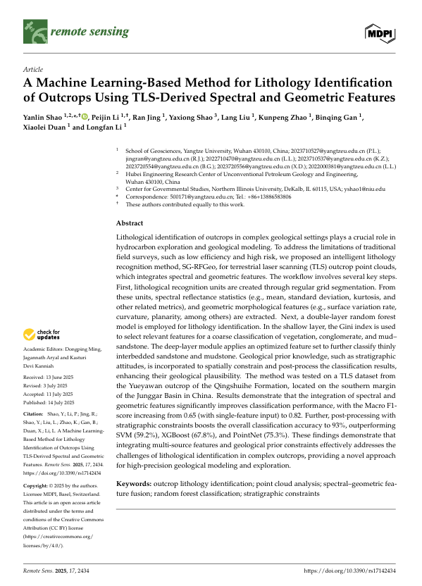 论文信息:Shao, Y.; Li, P.; Jing, R.; Shao, Y.; Liu, L.; Zhao, K.; Gan, B.; Duan, X.; Li, L. A Machine Learning-Based Method for Lithology Identification of Outcrops Using TLS-Derived Spectral and Geometric Features. Remote Sens. 2025, 17, 2434.https://doi.org/10.3390/rs17142434