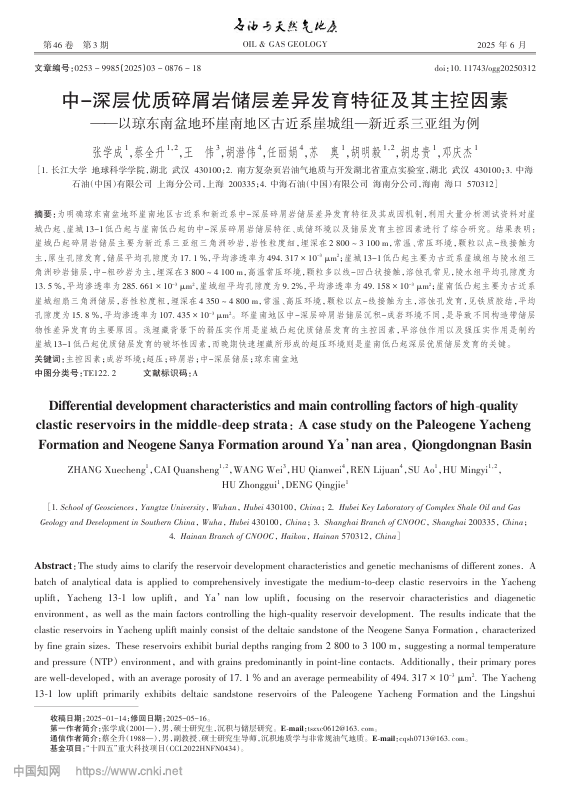 地球科学学院23级研究生张学成以第一作者身份在中文EI检索期刊《石油与天然气地质》上发表了题为“中-深层优质碎屑岩储层差异发育特征及其主控因素——以琼东南盆地环崖南地区古近系崖城组—新近系三亚组为例”的研究论文,乐竞体育在线为论文第一署名单位,其导师蔡全升副教授为论文通信作者。
