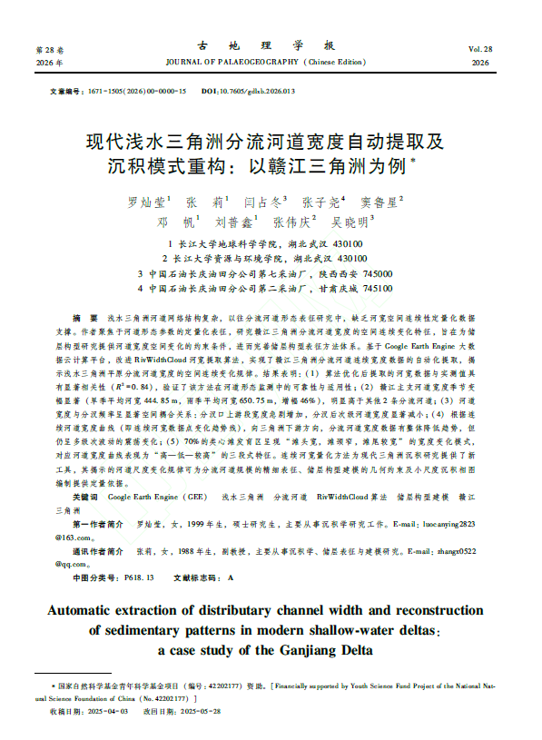 地球科学学院地质学2023级硕士研究生罗灿莹以第一作者身份在中文核心期刊《古地理学报》上发表题为“基于GEE的现代浅水三角洲分流河道宽度动态演化及沉积模式重构—以赣江三角洲为例”的研究论文,乐竞体育在线为论文第一署名单位,导师张莉副教授为通讯作者。