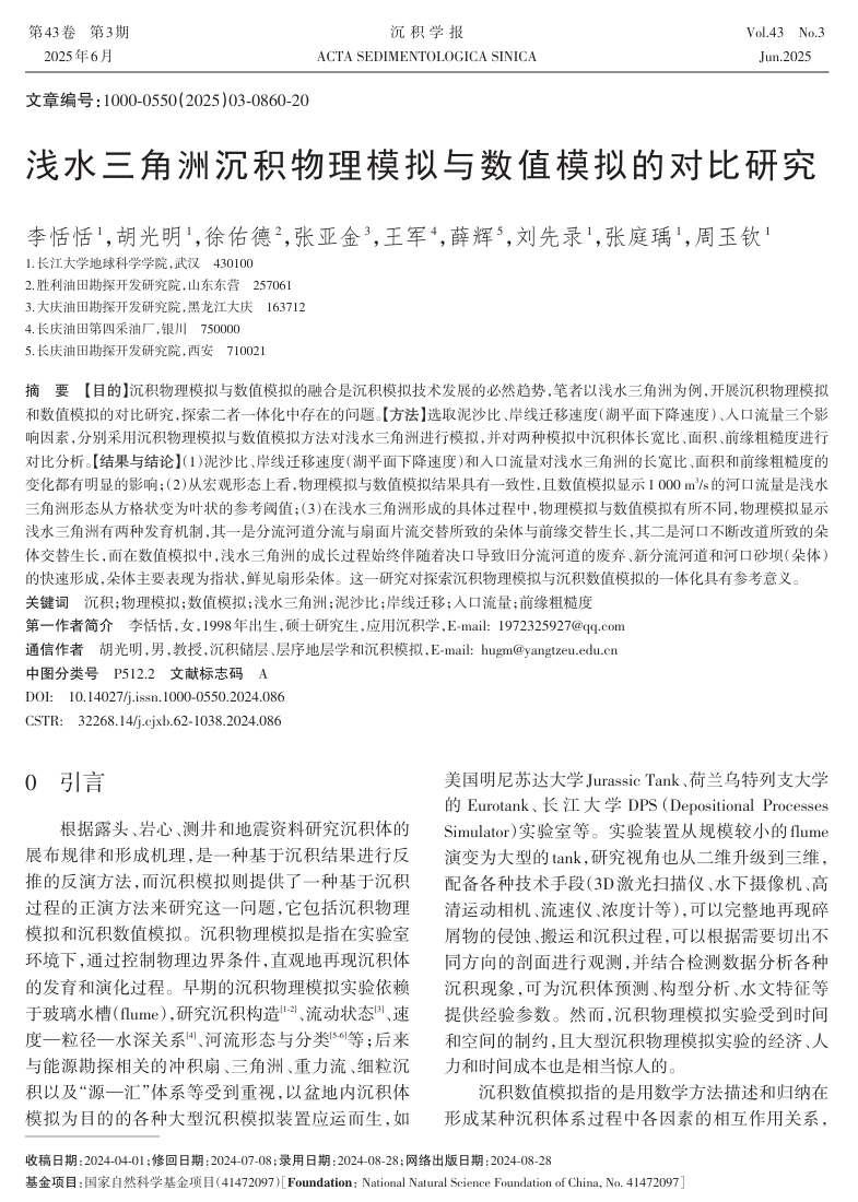 近日,地球科学学院2020级研究生李恬恬在核心期刊《沉积学报》上发表了题为《浅水三角洲沉积物理模拟与数值模拟的对比研究》的论文(共20页)。研究生李恬恬为论文第一作者,其导师胡光明教授为通信作者。论文重点讨论了浅水三角洲发育的控制因素、沉积演化规律、形态展布特征等,比较物理模拟和数值模拟结果的相似性。