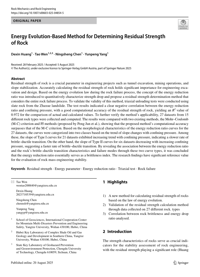 近日,地科学院2023级研究生黄德昕在期刊《Rock Mechanics and Rock Engineering》(最新影响因子为6.6,位列JCR分区一区,中科院大类一区)上发表论文“Energy Evolution-Based Method for Determining Residual Strength of Rock”。乐竞体育在线为论文第一署名单位,硕士研究生黄德昕为论文第一作者,其导师温韬教授为通讯作者。