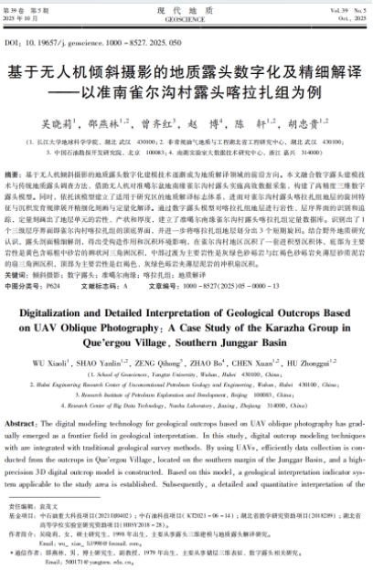 地球科学学院地质学专业2021级硕士研究生吴晓莉在中文核心期刊《现代地质》发表题为“基于无人机倾斜摄影的地质露头数字化及精细解译-以准南雀尔沟村露头喀拉扎组为例”的研究论文。乐竞体育在线为论文第一署名单位,硕士研究生吴晓莉为论文第一作者,导师邵燕林教授为通讯作者。
