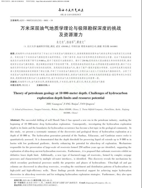 近期,地球科学学院朱光有教授应邀在《石油与天然气地质》杂志上撰写“万米深层油气地质学理论与极限勘探深度的挑战及资源潜力”文章(共19页),系统总结了万米深层油气勘探发现与地质学理论。(1)刻画了南华系、埃迪卡拉系和寒武系烃源岩的空间展布规律,计算出关键地质历史时期的生气强度和生烃量,奠定了超深层油气勘探的资源基础,为开辟万米深层勘探空间和预测万亿立方米大气田分布区打下了基础。(2)论证了低地温场盆地液态石油保存深度下限可达9000 m,突破了石油勘探深度下限6000 m的传统认识,提升了超深层石油勘探潜力,并被近期超深井钻探证实。(3)揭示了2.5亿年前形成的大型油藏超长寿命的保存机制,修订了油气藏保存极限寿命的界定,推动超深层油气勘探重大发现与战略突破。(4)超深层碳酸盐岩储层非均质性极强,古老碳酸盐岩储层不存在深度下限。(5)发现复杂渗流形成的多油水界面缝洞型油藏新类型,提出横纵向无统一边界的大面积层状缝洞型油藏断珠体概念,丰富了油气藏类型,突破了传统背斜高点找油理论。(6)建立了原油裂解程度和油气相态的快速判识图版,揭示了次生地球化学作用对油气性质与相态的改造机制。(7)发现超深层超高油气柱,油柱高度近千米的油藏,揭示了高产高效井富集分布规律,打破油气勘探黄金带理论,揭示了万米深层超高油气柱形成与富油气区分布机制。这些研究成果为超深层重大发现及勘探战略变革提供了理论支撑,开辟了万米深层油气勘探空间。